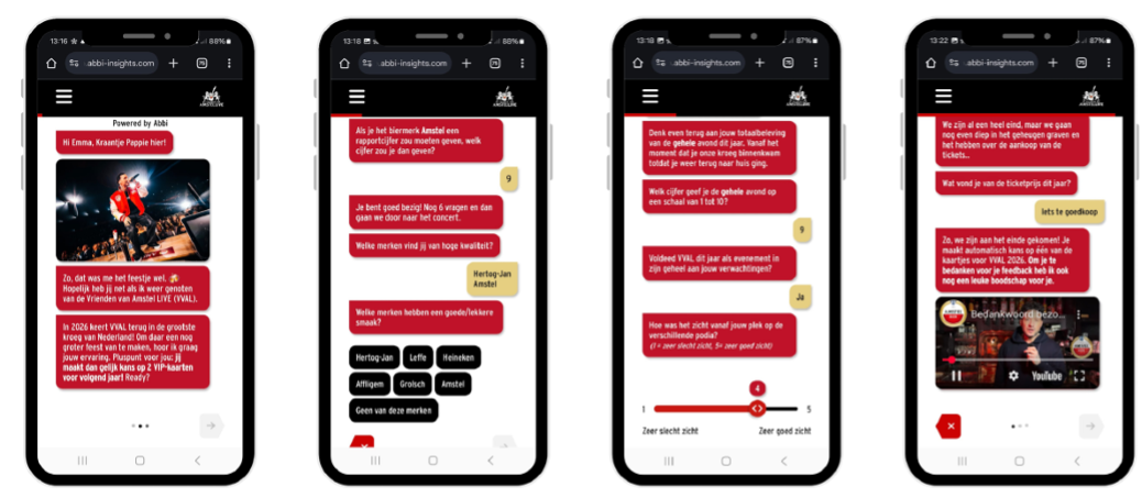 Bij De Vrienden van Amstel LIVE draait alles om sfeer, muziek, samen zijn en plezier. Dus waarom dat niet doortrekken tot het laatste moment? Geen lange, saaie vragenlijsten, maar een onderzoek dat net zo persoonlijk en gezellig is als het event zelf. Daarom werd de bezoekersevaluatie dit jaar omgetoverd tot een interactieve chatsurvey, mét niemand minder dan ‘kroegbaas’ Kraantje Pappie als digitale host.